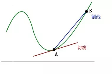 传统上我们可以这样定义切线:先随便画一个直线,让这条直线与曲线有两个交点,这样的直线叫割线(仿佛把曲线“割断”了,如下图蓝色的AB)。然后,我们让B点沿着曲线慢慢向A点靠近,直观上,等到B点和A点重合之后,割线AB就变成了曲线在A点的切线。