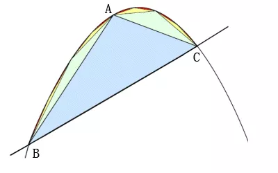 他先画了一个蓝色的大三角形ABC(这个三角形并不是随意画的,抛物线在A点处的切线必须跟BC平行。这里我们不细究,只要知道能够画出这样一个三角形就行)。当然,这个三角形ABC的面积肯定比弓形的面积小,小多少呢?显而易见,小了左右两边两个小弓形的面积。