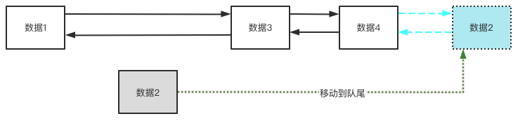 1、当程序需要获取数据2时,把数据2的前后引用都移除,插入到链表最右端;把数据1的后引用改为数据3,把数据3的前引用改为数据1。